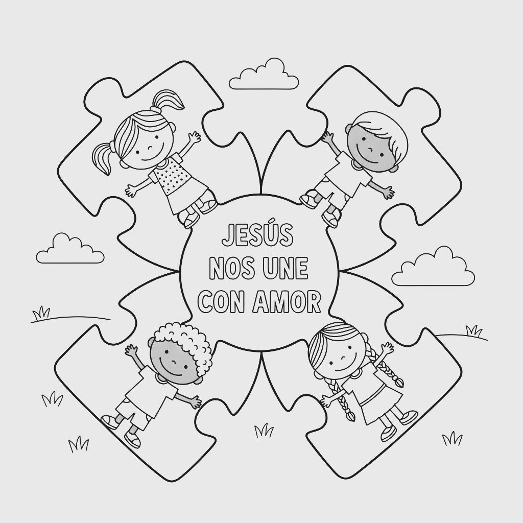 Dibuja un rompecabezas donde varios niños estén tomados de la mano y escribe en el centro: